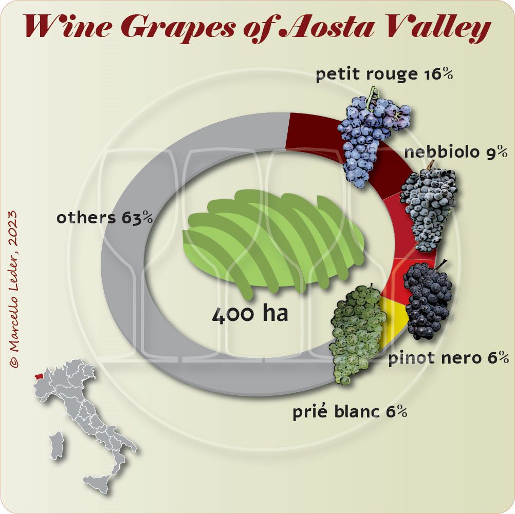 Among the international black grape varieties cultivated in Valle d’Aosta, Pinot Noir is the most prominent, accounting for 7% of the total vineyard area, followed by Gamay, Merlot, and Syrah, each covering less than 1% of the total vineyard area. The leading white international grape variety is Chardonnay, occupying about 4% of the vineyard area, followed by Pinot Gris (3%), known as Malvoisie in the Nus area, and Müller-Thurgau (3%). Small quantities of Pinot Blanc and T Gewürztraminer are also present, although they are not part of any official wine style. This diversity of grape varieties, both native and international, contributes to the unique and varied wine profile of Valle d’Aosta, reflecting the region’s distinctive terroir and winemaking heritage.
