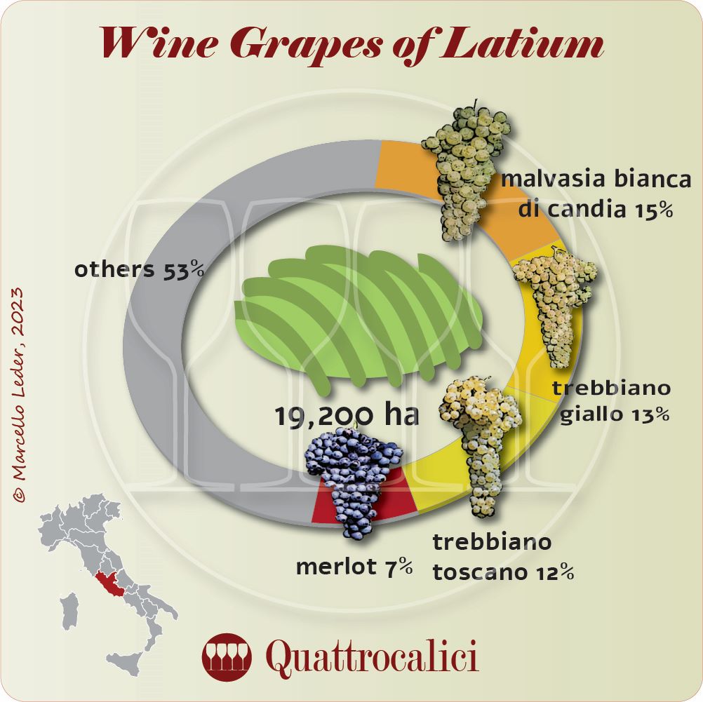In Lazio, a significant number of grape varieties, both indigenous and international, are cultivated. White grape varieties, such as Trebbiano and Malvasia, or Bellone, which is widespread in the Castelli Romani area, account for 76% of the total. Among these, we find Malvasia Bianca Lunga, Malvasia Bianca di Candia, Malvasia del Lazio (with the Bellone, Cacchione, and Bonvino Bianco clones), Trebbiano Giallo, Trebbiano Toscano, and Trebbiano del Lazio. Grechetto is a grape variety primarily cultivated in the areas of Viterbo at the borders with Umbria.
