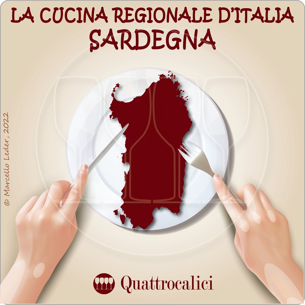 Sardinian land cuisine is based on very simple ingredients and is very varied from area to area. Among the appetizers, there are pork or wild boar hams, sausages, and cold cuts. “First courses” include Sardinian gnocchetti, flavored with saffron or served with sausage sauce, Culurgiones, dumplings filled with ricotta and mint, Macarrones de busa, a kind of bucatini made with a special elongated iron, Macarrones furriaos, gnocchetti seasoned with very fresh pecorino, melted together with semolina to form a sort of cream. Pasta dishes can be paired, for example, with a Cannonau di Sardegna rosé. Main courses are based on roast meat, but also boiled, stewed, or based on the “fifth quarter”. Porceddu is a suckling pig, cooked on a spit and flavored after cooking with myrtle or rosemary. Roast milk lamb (Anzone) is one of the island’s oldest traditions. Wild boar meat (Sirbone) is traditionally cooked with the carraxu method (in a buried pit). These dishes pair best with a traditional Cannonau di Sardegna red wine.