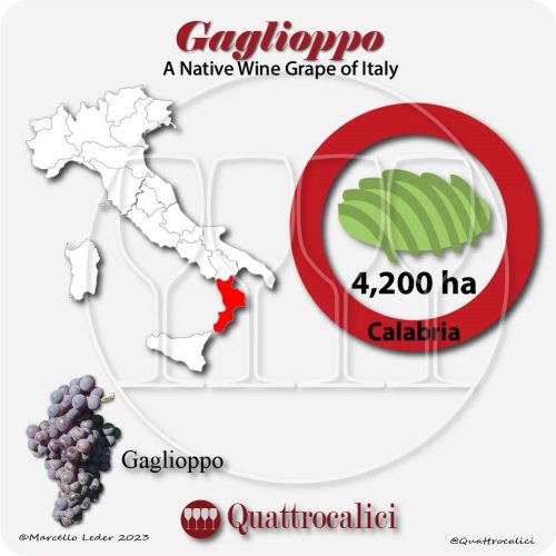 The Gaglioppo grape is a native black grape variety from Calabria, probably of Greek origin, and has spread predominantly in the coastal areas of the region. Gaglioppo is the most widespread variety in Calabria, found in all the region’s red DOC wines, the most significant of which is Cirò Rosso. The origin of the name seems to trace back to the local dialect, where Gaglioppo means “closed fist,” due to the compactness of the cluster. In the area of Cirò Marina, ancient Crimissa, the first Greek colonizers, driven by the desire to find new commercial outlets, made nearby Sibari a key center for wine production, which was then exported throughout the Mediterranean. The wine obtained from Gaglioppo, called Krimisa, became famous and appreciated until the decline of Magna Graecia, which brought down the fate of many Mediterranean grape varieties.