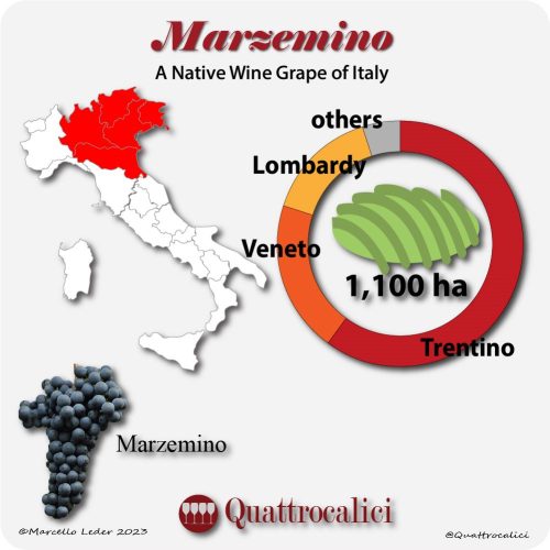 The differences between the two subspecies can be observed in the presence or absence of tomentum (hairiness) on the underside of the leaf, the characteristics of the rachis (herbaceous or woody), the texture of the berry, and the thickness of the skin. In both cases, Marzemino has long, pyramidal, winged, and compact clusters. The berries are medium-sized, spherical, with a fine, resistant, pruinose skin, and are bluish-black in color. Another characteristic of Marzemino is the reddish-violet coloration the foliage takes on in the summer. The Marzemino grape variety prefers poor soils with calcareous, clayey, or basaltic characteristics, with good exposure and protection from the wind. It suffers from powdery mildew, botrytis, and rot but does not have significant issues with downy mildew. It has very high yields, which, if kept under control, can produce interesting wines. It is generally trained using the pergola system. In Emilia and Veneto, it is sometimes used to produce light, semi-sweet, or occasionally sweet sparkling wines. In the Conegliano area, when properly dried, it forms the base of Refrontolo Passito wine. When vinified in purity, Marzemino produces wines with deep color and elegant fruity aromas, with floral nuances of violet. On the palate, these wines have good alcohol content, with smooth tannins balanced by a pleasant sapidity. In Trentino, it finds its ideal territory to produce more important and structured wines, especially in the Isera and Ziresi subzones of Trentino DOC, near the Vallagarina, south of the provincial capital, where it takes on balsamic and spicy notes and mint nuances, which are rare in other regions. It is part of numerous other denominations of origin, such as Garda DOC, the aforementioned Colli di Conegliano DOCG, Bardolino DOC, Breganze DOC, Botticino DOC, Trentino DOC, Colli di Scandiano e Canossa DOC, Reggiano DOC, and others.